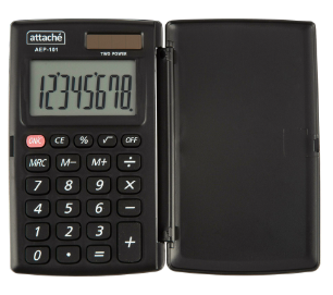 Калькулятор Attache карманный AEP-101 с крышкой с 8-разрядным ЖК-дисплеем. Подходяит как для использования в школе, так и в любых универсальных целях. Эргономичная форма панели и достаточно крупные клавиши создают максимальный комфорт в использовании. Оптимальный и необходимый набор функций, среди которых: MRC, M+, M-, расчет процентов. Функция коррекции вычислений: нет. Пересчет курса валюты: нет. В калькуляторе имеется два источника питания: батарейка типа LR1130 (входит в комплект) и солнечная батарея.